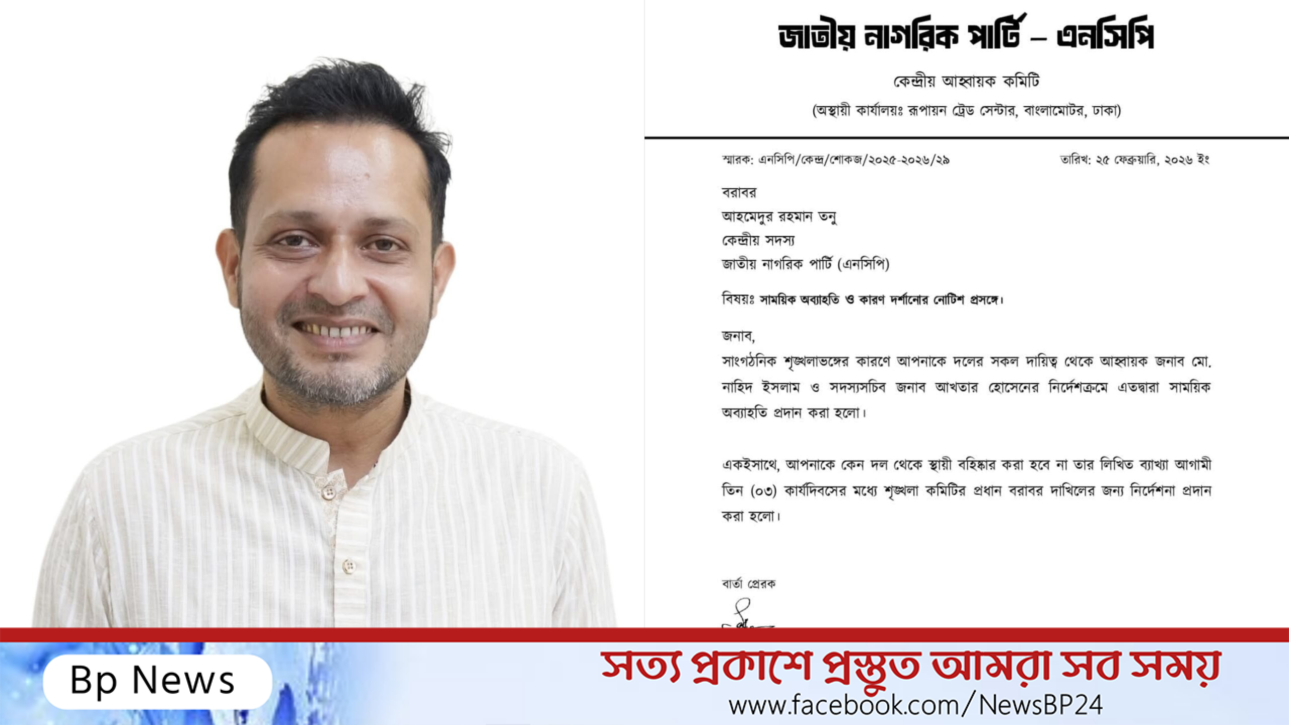 ২৫ ফেব্রুয়ারি ২০২৬ তারিখে জারি করা নোটিশে বলা হয়, সাংগঠনিক শৃঙ্খলাভঙ্গের অভিযোগে তাকে দলের সকল দায়িত্ব থেকে সাময়িকভাবে অব্যাহতি দেওয়া হয়েছে। নোটিশে আরও উল্লেখ করা হয়, কেন তাকে স্থায়ীভাবে বহিষ্কার করা হবে না—সে বিষয়ে আগামী তিন কার্যদিবসের মধ্যে শৃঙ্খলা কমিটির প্রধানের নিকট লিখিত ব্যাখ্যা দিতে নির্দেশ দেওয়া হয়েছে।