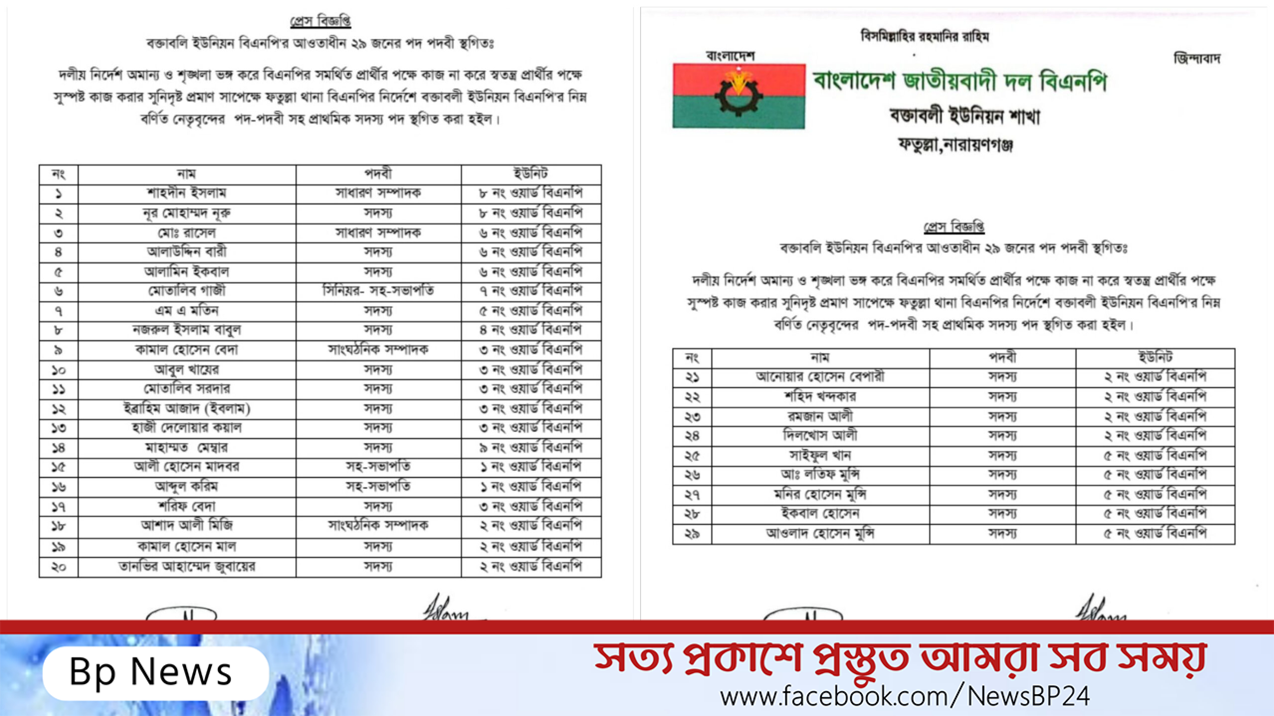 প্রেস বিজ্ঞপ্তিতে বক্তাবলী ইউনিয়ন বিএনপির সভাপতি নজরুল ইসলাম ইসলাম প্রধান ও সাধারণ সম্পাদক মতিউর রহমান ফকির স্বাক্ষর করেন।