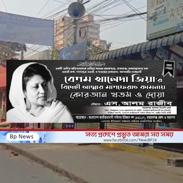 নিজস্ব প্রতিনিধিঃ বাংলাদেশের প্রথম ও তিনবারের জনপ্রিয় প্রধানমন্ত্রী, মাদার অব ডেমোক্রেসি খ্যাত, বিএনপি'র চেয়ারপার্সন মরহুমা বেগম খালেদা জিয়ার বিদেহী আত্মার মাগফেরাত কামনায় আজ নারায়ণগঞ্জ মহানগর বিএনপি নেতা ও বাংলাদেশ জাতীয়তাবাদী সাইবার ইউজার দল -কেন্দ্রীয় নির্বাহী কমিটির প্রতিষ্ঠাতা সভাপতি এস. আলম রাজীব -এর উদ্যেগে শহরের জামতলাস্থ তার নিজ বাসভবনের আশপাশের এলাকা তোলারাম কলেজের মোড় থেকে শুরু করে মাসদাইর শেরে বাংলা রোডের মোড় পর্যন্ত পুরো এলাকাজুড়ে মাইক লাগিয়ে সকাল থেকে সন্ধ্যা এশার নামাজের পূর্ব পর্যন্ত দিনব্যাপী কোরআন তিলাওয়াতের আয়োজন করেন।   সেই সাথে এস. আলম রাজীব কর্তৃক প্রতিষ্ঠিত দেশের ইতিহাসে সর্বপ্রথম সাইবার রাজনৈতিক সংগঠন 'বাংলাদেশ জাতীয়তাবাদী সাইবার ইউজার দল (বিএনসিইউপি)'র পক্ষ থেকে শোকবার্তা প্রদান, সংগঠনের কেন্দ্রীয়, জেলা, প্রবাসী, মহানগর, উপজেলা, থানা সহ সকল ইউনিট কমিটিকে ৭ দিনের শোক পালন, কালো শোক বেইজ ধারণ, সোস্যাল মিডিয়ায় নিজ নিজ প্রোফাইল, পেইজ ও গ্র‍্যুপে সবাই একই রকম নির্দিষ্ট প্রোফাইল পিকচার ব্যবহার সহ কোরআন খতম ও দোয়ার কর্মসূচী তিনি ঘোষণা করেন এবং বেগম খালেদা জিয়ার মৃত্যুর শোককে শক্তিতে রূপান্তর করে প্রয়াত নেত্রীর গণতন্ত্র মুক্তির আন্দোলনে ও জনগণের অধিকার আদায়ের সংগ্রামে আপসহীন নেতৃত্বকে অনুপ্রেরণা হিসেবে লালন করে ৩১ দফা বাস্তবায়নের মাধ্যমে বিএনপি'র ভারপ্রাপ্ত চেয়ারম্যান তারেক রহমানের সুযোগ্য ও দূরদর্শী নেতৃত্বে নতুন বাংলাদেশ বিনির্মাণে সক্রিয় ভূমিকা পালনেরও শপথ নেন।