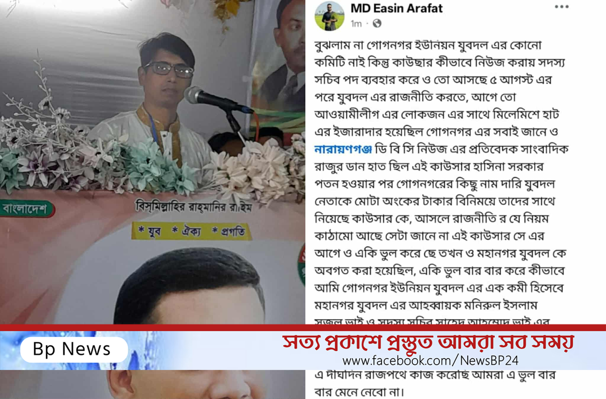 গোগনগর ইউনিয়ন ছাত্রদলের সাবেক সভাপতি ও যুবদল নেতা মোঃ ইয়াসিন আরাফাত সামাজিক যোগাযোগমাধ্যমে এ একটি পোস্ট করে তা হুবুহু তুলে ধরা হলো।