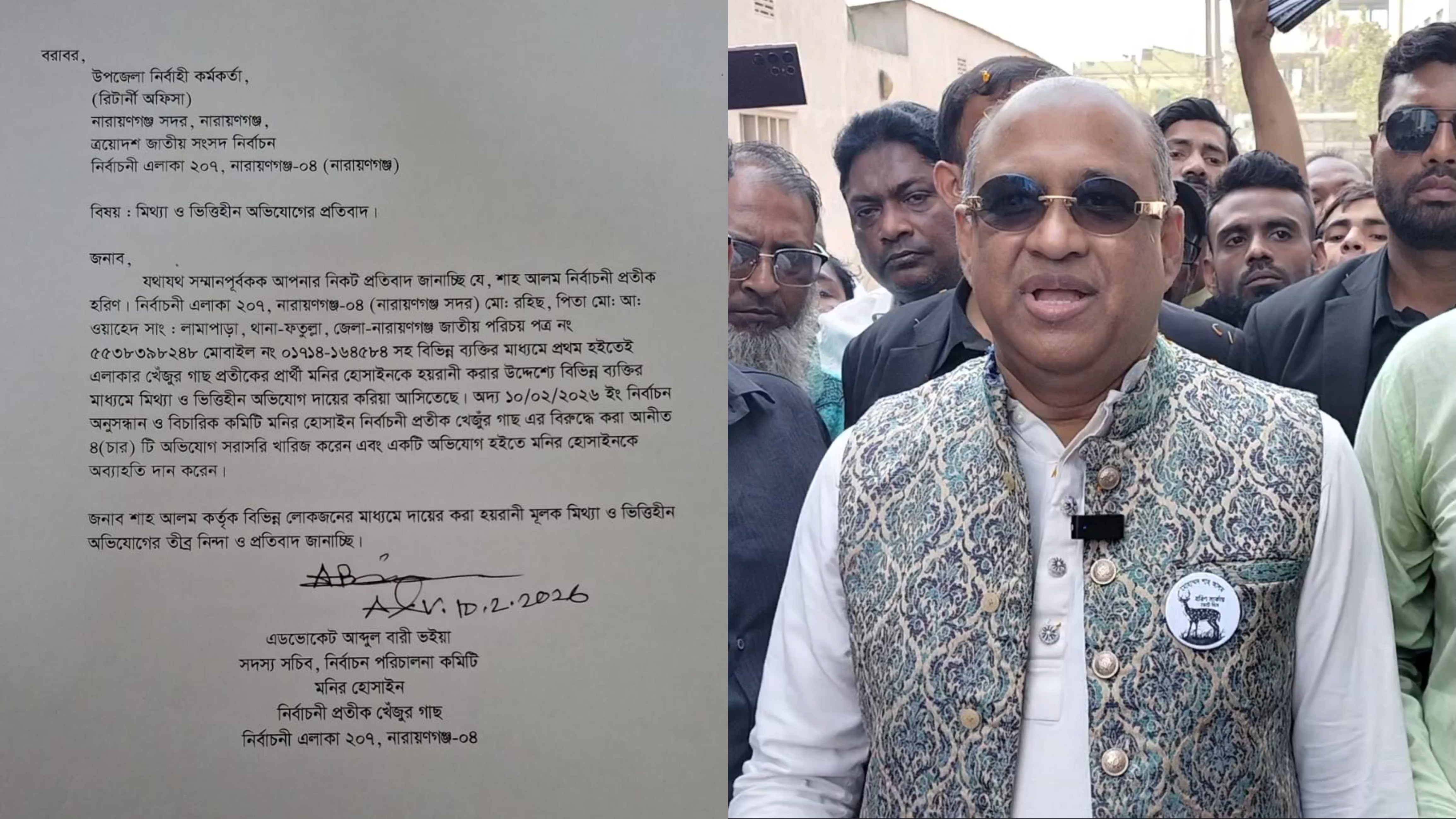 নারায়ণগঞ্জ–৪ আসনের বিএনপি জোট মনোনীত প্রার্থী মনির হোসাইন কাসেমীকে জড়িয়ে মিথ্যা ও ভিত্তিহীন অভিযোগ করা হচ্ছে—এমন অভিযোগ তুলে আনুষ্ঠানিকভাবে প্রতিবাদ জানানো হয়েছে।
