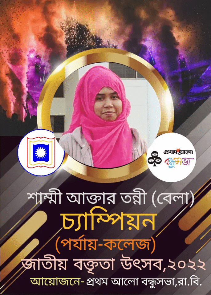জাতীয় বারোয়ারি বিতর্ক প্রতিযোগিতা ২০২১ এ জাতীয় পর্যায়ে চ্যাম্পিয়ন হওয়ার পর এবার জাতীয় বক্তৃতা উৎসব ২০২২ এ চ্যাম্পিয়ন হলেন কুষ্টিয়ার সেই গুণবতী মেয়ে বেলা।