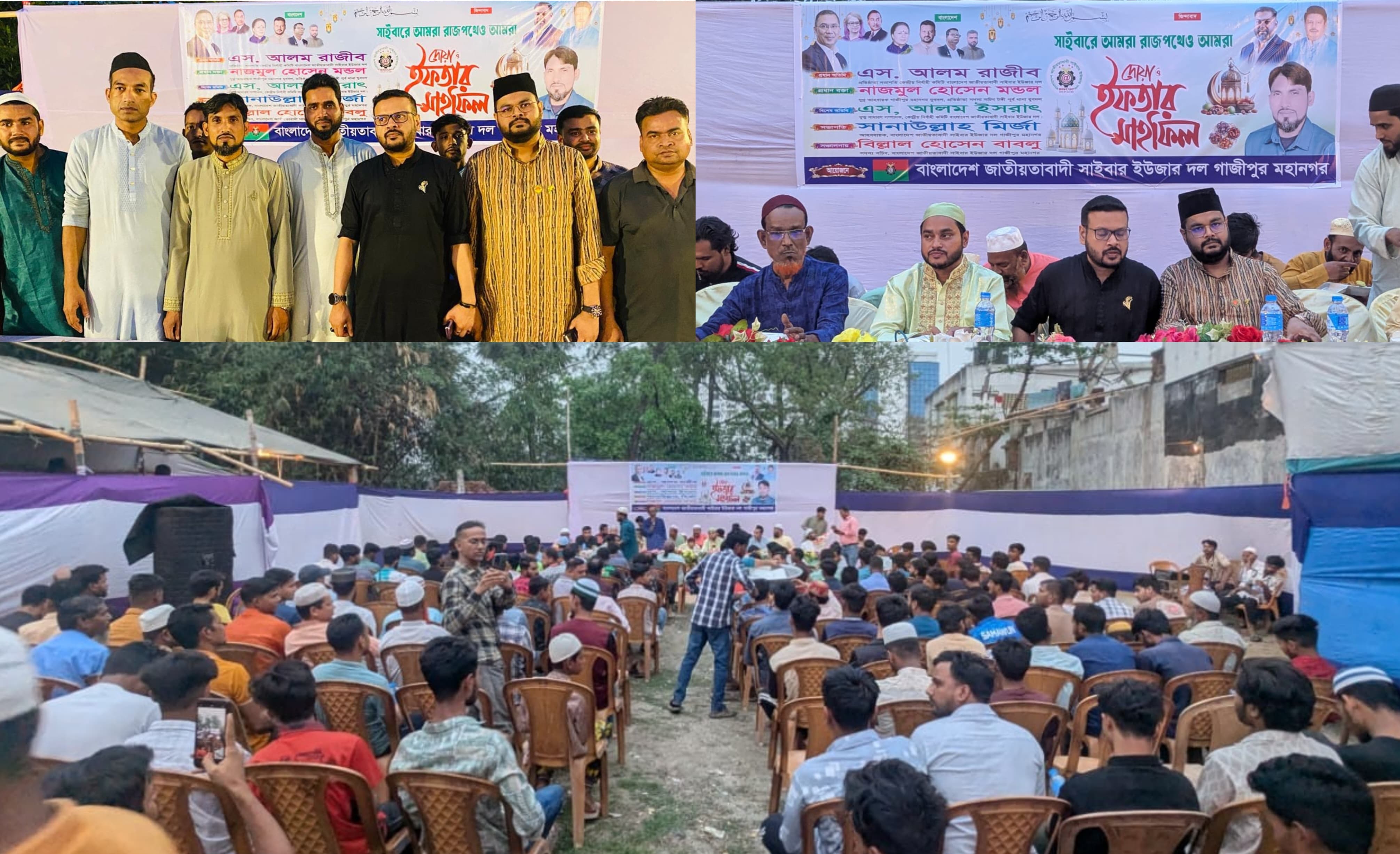 গাজীপুর মহানগর সাইবার ইউজার দলের আহ্বায়ক মোঃ সানাউল্লাহ মির্জার সভাপতিত্বে ও সদস্য সচিব বিলাল হোসেন বাবলুর পরিচালনায় উক্ত ইফতার মাহফিলে প্রধান অতিথি হিসেবে উপস্থিত ছিলেন বাংলাদেশ জাতীয়তাবাদী সাইবার ইউজার দল-কেন্দ্রীয় নির্বাহী কমিটির প্রতিষ্ঠাতা সভাপতি ও তারেক রহমানের ঢাকা-১৭ আসনের ডিজিটাল প্রচারণা কমিটির আহবায়ক এস. আলম রাজীব। প্রধান বক্তা হিসেবে উপস্থিত ছিলেন গাজীপুর মহানগর যুবদলের যুগ্ম-আহ্বায়ক ও টঙ্গী পূর্ব থানা যুবদলের প্রতিষ্ঠাতা সদস্য নাজমুল হোসেন মন্ডল, বিশেষ অতিথি হিসেবে উপস্থিত ছিলেন কেন্দ্রীয় ইউজার দলের সহ-সাধারণ সম্পাদক ও দেশব্যাপী জেলা ইউনিট কমিটির সমন্বয়ক এস. আলম ইসরাৎ।